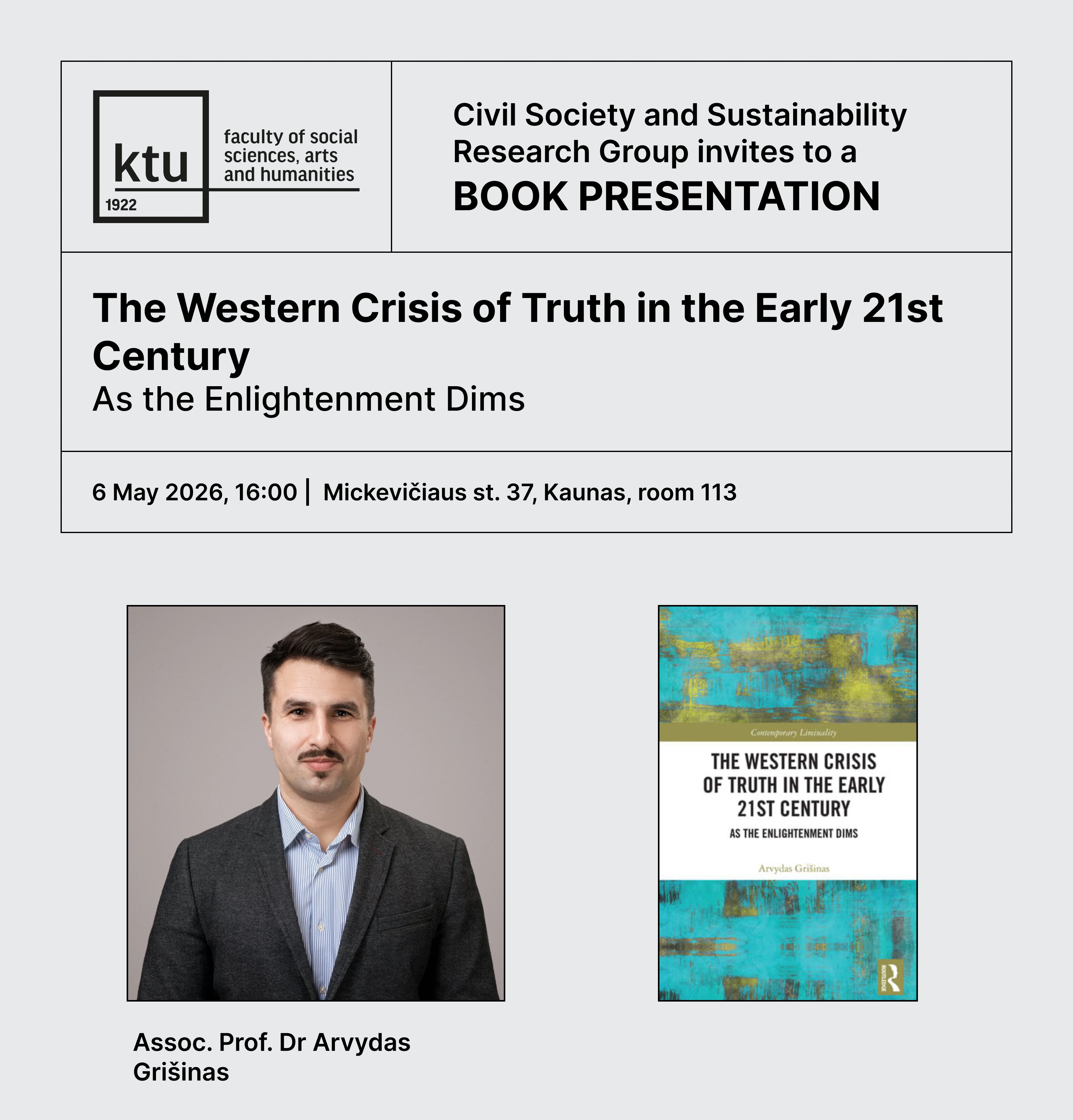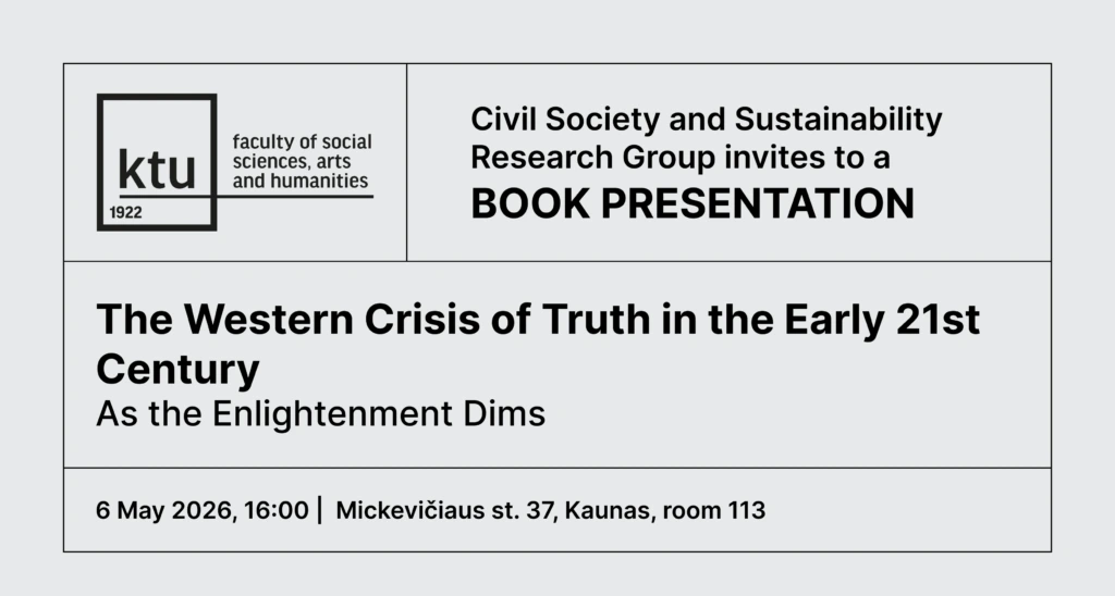 Socialinių, humanitarinių mokslų ir menų fakulteto mokslo grupė „Pilietinė visuomenė ir darnus vystymasis“ kviečia į dr. Arvydo Grišino knygos „The Western Crisis of Truth in the Early 21st Century. As the Enlightenment Dims“ pristatymą, Socialinių, humanitarinių mokslų ir menų fakultete (A. Mickevičiaus g. 37, Kaunas), 113 auditorijoje.