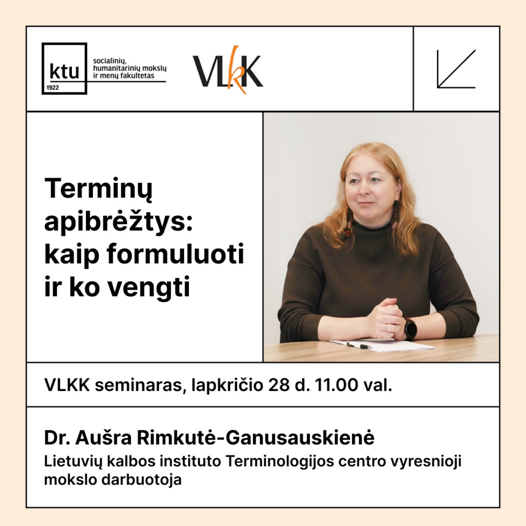 Lapkričio 28 d. 11:00 val. kviečiame Kauno technologijos universiteto (KTU) bendruomenę į Valstybinės lietuvių kalbos komisijos organizuojamą seminarą „Terminų apibrėžtys: kaip formuluoti ir ko vengti“, kurį ves Lietuvių kalbos instituto Terminologijos centro vyresnioji mokslo darbuotoja